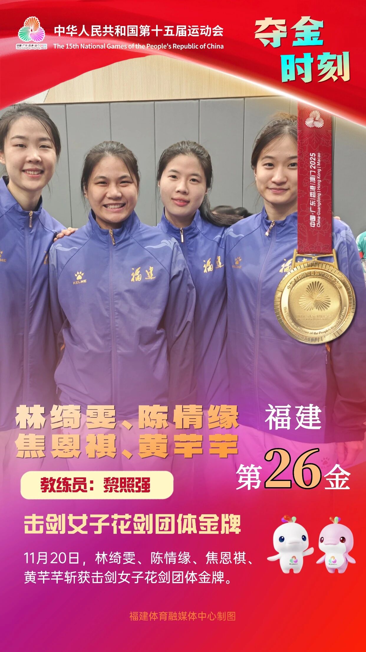 由泉州市输送的运动员黄芊芊,2002年2月出生,2018年3月进入省击剑队,曾获2023年杭州亚运会女花团体金牌和个人金牌、亚洲击剑锦标赛女花团体第二名、全国击剑冠军赛总决赛女花团体金牌和个人第二名、全国击剑锦标赛女花个人金牌,2024年亚洲击剑锦标赛女花团体第二名、全国击剑锦标赛女花团体金牌和个人金牌,2025年全国击剑冠军赛总决赛暨全运会预赛第二站女花团体金牌、全国击剑锦标赛女花个人金牌。