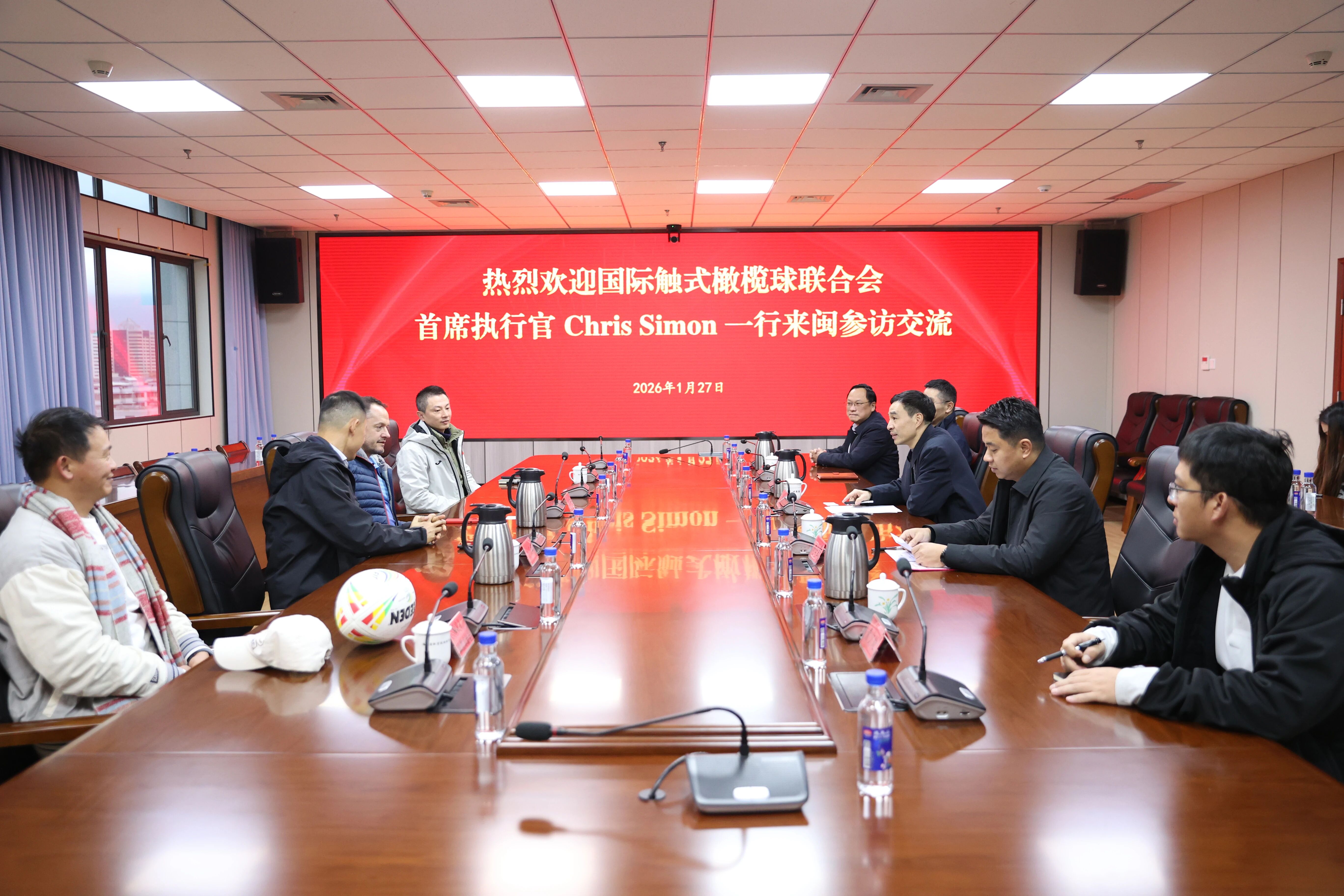 1月27日,国际触式橄榄球联合会首席执行官 Chris Simon 一行来闽参访交流。福建省体育局党组书记、局长叶得盛会见代表团一行,双方围绕触式橄榄球国际交流与未来合作前景展开深入交流。