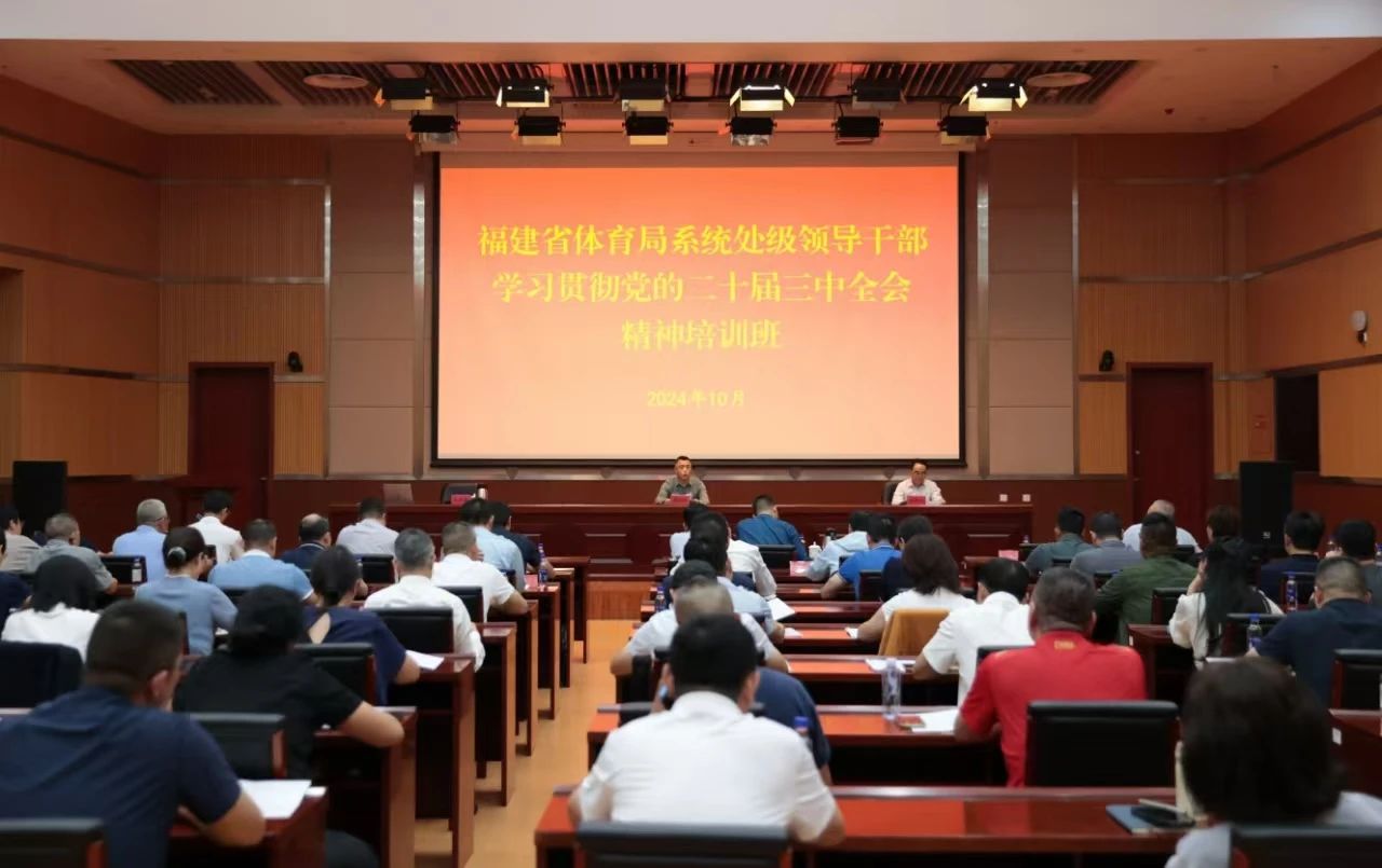 10月27日-29日,省体育局在福州举办局系统处级领导干部学习贯彻党的二十届三中全会精神培训班。本次培训班通过局主要领导宣讲、“三争”行动交流研讨、专题辅导讲座、观看党性教育影片、现场教学、福建干部网络学院线上自学等方式,在全省体育系统兴起学习宣传贯彻热潮。省体育局党组副书记、副局长董劲松同志出席培训班闭学式并作讲话。