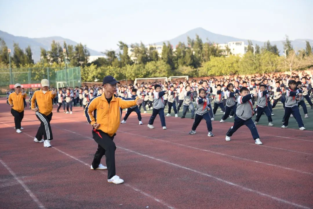 在莆田荔城区西天尾中心小学的操场上,约850名学生正进行着“南少林非遗武术进校园”期末展演活动。现场气势恢宏、震撼人心,同学们精神饱满、动作刚劲有力,每一次踢腿、出拳,都伴随着响彻云霄的呐喊声,彰显出蓬勃朝气与活力。